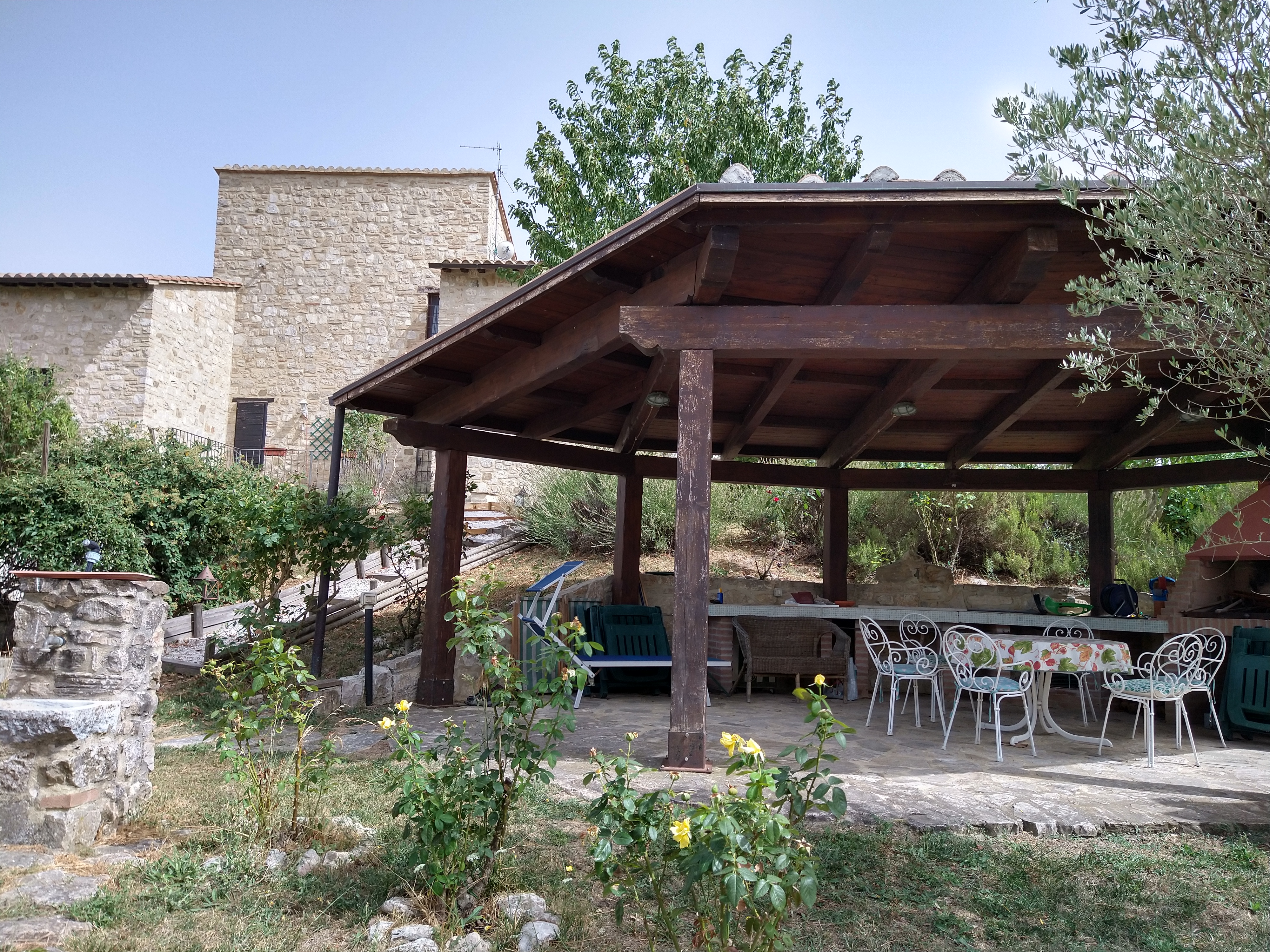 Een omheind terrein van 30 are met afstandsbediende toegangspoort. Grote tuin rondom de villa met overal elektriciteit, water, verlichting. Privéparking voor verschillende auto’s. Een terras vooraan met ochtendzon. Nog een terras en een groot balkon achteraan. Zwembad (zie fotogalerij). Overdekte kookgelegenheid met eetplaats, barbecue en pizzaoven. Overweldigend uitzicht in alle richtingen.